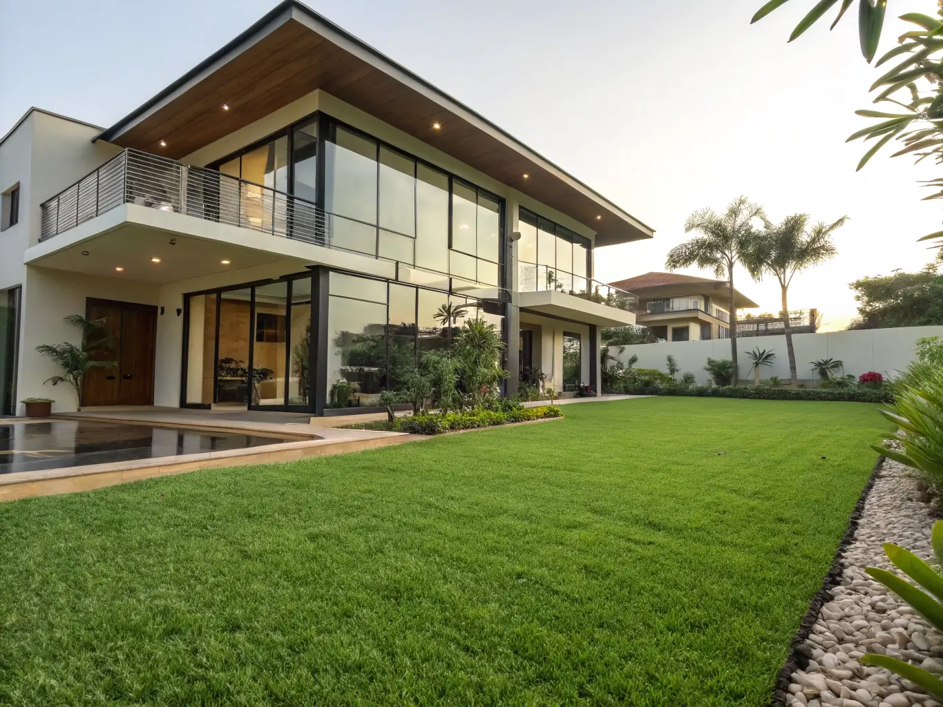 - Exterior view of a modern, two-story family home with large windows and a landscaped yard.